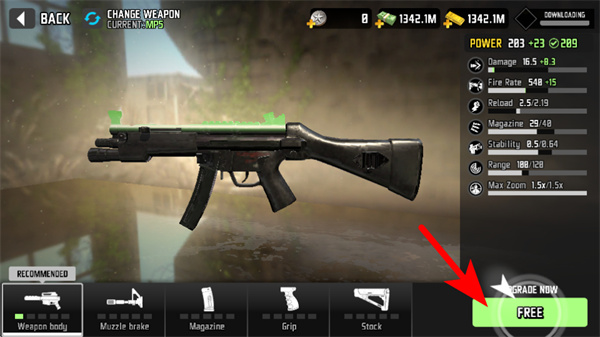 2、找到箭头标注的升级按钮,点击它强化当前武器,这是提升战斗能力的基础操作,点击后武器属性会得到增强以应对敌人。