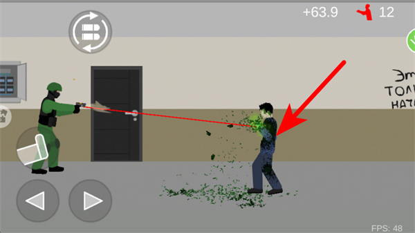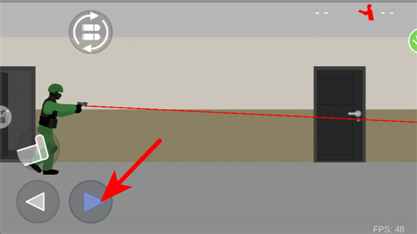 3、紧跟红色箭头指引,瞄准出现的僵尸进行射击,清理当前走廊的敌人,同时注意保留生命值以应对后续关卡。