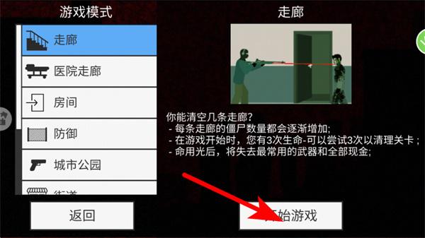 1、进入游戏界面后,选择走廊模式并点击开始游戏按钮,这是进入关卡的关键操作,准确点击才能开启任务。