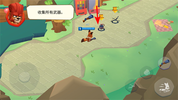 2、进入场景后操控角色移动至武器位置,这是收集装备的基础操作,靠近武器后可自动拾取,提升角色的战斗能力,为对战铺垫。