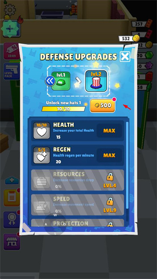 4、消耗资源升级防御属性,提升角色生存能力,同时解锁新外观。