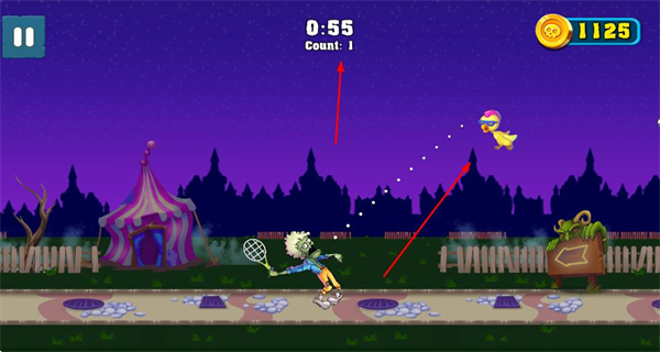 1、在场景中进行挑战,如用网球拍击球,关注时间计数与目标数量。