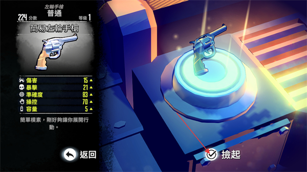 4、到达枪械具象器处后,查看简易左轮手枪的属性,点击捡起按钮获取该武器以用于后续战斗。