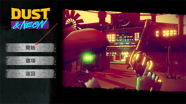 1、进入尘烟霓虹的启动界面后,找到界面中的开始按钮并点击,即可进入游戏的剧情与游玩环节。