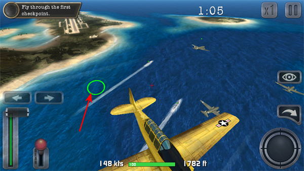 2、驾驶飞机穿过检查点,这是推进任务的核心操作,穿过时需关注检查点的位置并调整飞行方向。