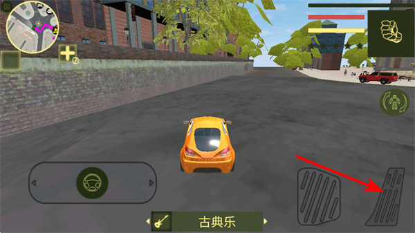2、驾驶汽车时,点击右侧的油门按键,可提升汽车速度,快速在城市中移动进行升级。