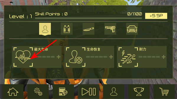 4、在技能界面,点击最大生命的升级选项,可提升机器人的生命值,增强生存能力。