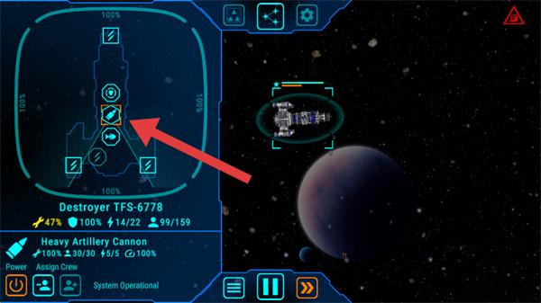 3、战斗时点击飞船的武器模块,激活并使用武器如重型火炮攻击敌人,需瞄准敌方飞船的关键部位,提升效果。