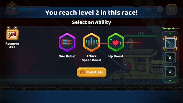 3、等级提升后选择能力如AttackSpeedBoost,增强火车战力。
