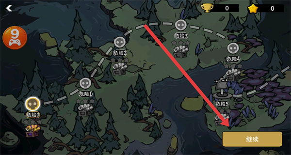 3、在地图界面,通过再次点击继续,进入游戏关卡。