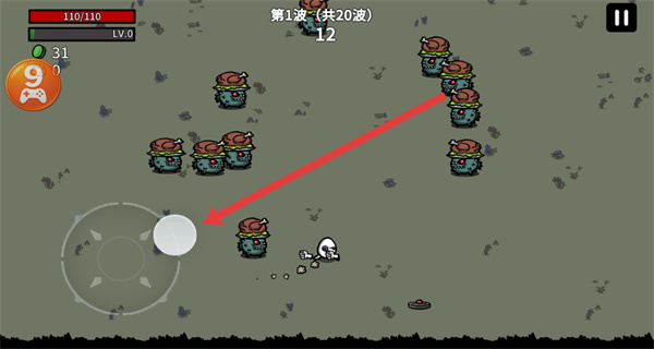 4、在游戏中,通过左下角的虚拟摇杆控制角色移动,躲避怪物并击败它们,完成20波怪物的挑战。