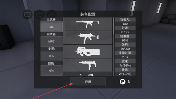 2、在装备配置界面,选定主武器M4、副武器MP7后,点击应用按钮确认装备配置,以便进入战斗环节。