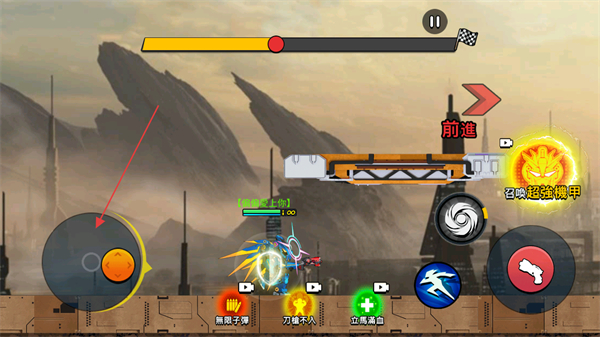 2、通过滑动左侧屏幕控制机甲前往箭头指示的位置开始战斗。