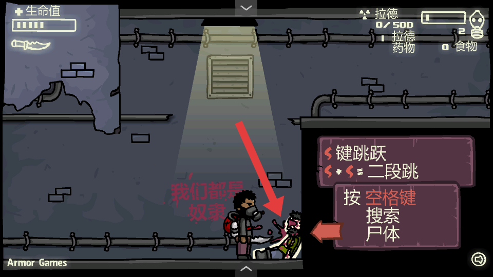 3、靠近尸体时,按空格键搜索尸体,并查看情况,有机会获取道具、资源等,为后续的探险提供相关帮助。