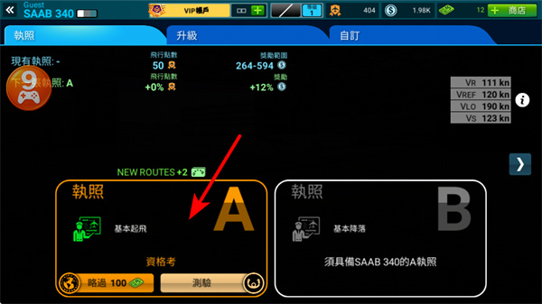 2、在执照界面,针对SAAB340的A执照,点击资格考按钮,参与基本起降的资格考试,提升驾驶资质。