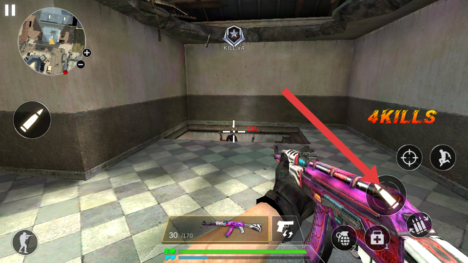 2、参与者遇到近距离敌人时,点击箭头指向的武器攻击按键,向敌人开火,快速消灭敌人,保障自身的安全。
