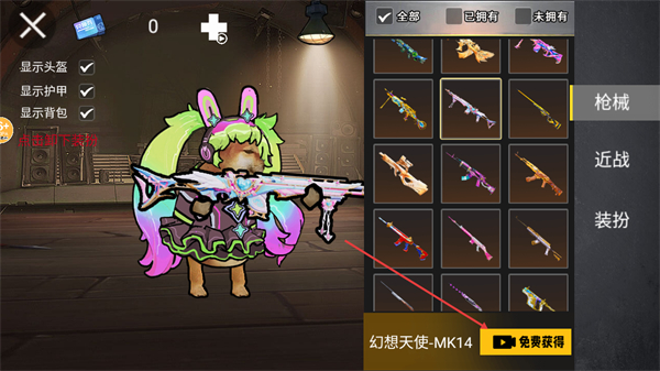 3、在枪械皮肤商城中,点击想要的枪械皮肤后,点击下方的免费获得即可直接进行装扮。