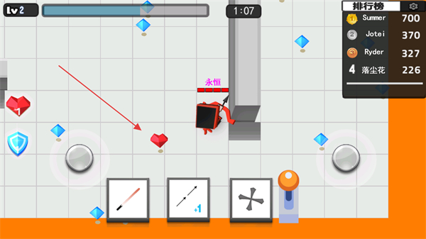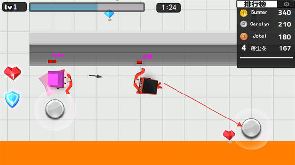 3、点击右侧按钮控制角色移动,收集红色爱心道具,恢复生命值,继续参与对战。
