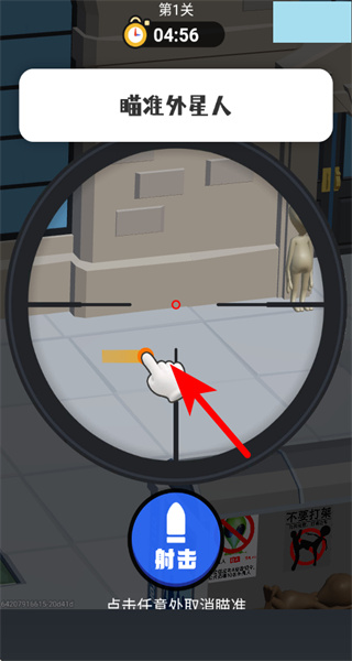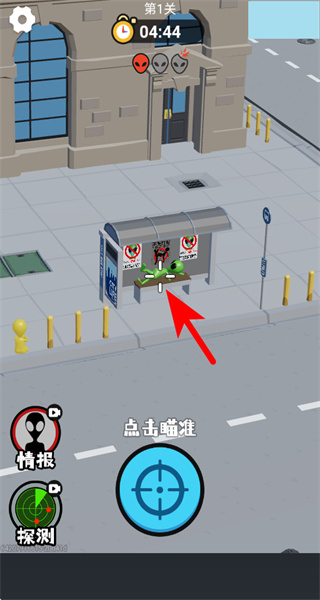 2、游戏中点击瞄准按钮,可进入狙击视角,锁定长椅上的隐藏外星人目标。