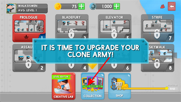 2、在游戏主界面,点击COLLECTION选项,可进入克隆军队升级界面,及时升级你的克隆军队,提升作战能力。