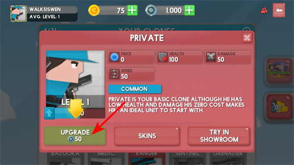 3、针对基础克隆士兵PRIVATE,点击UPGRADE按键,消耗资源进行升级,可提升其生命值和伤害,增强战斗实力。