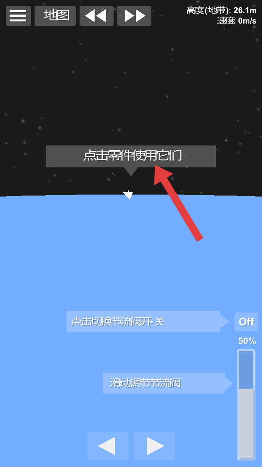 4、在火箭飞行过程中,点击零件使用它们,根据飞行状态调整火箭的部件功能,保障火箭飞行。