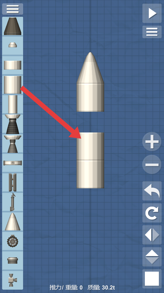 1、在火箭建造界面,选择左侧的圆柱形部件,将其组装到火箭主体上,逐步构建火箭的结构,为后续发射做准备。
