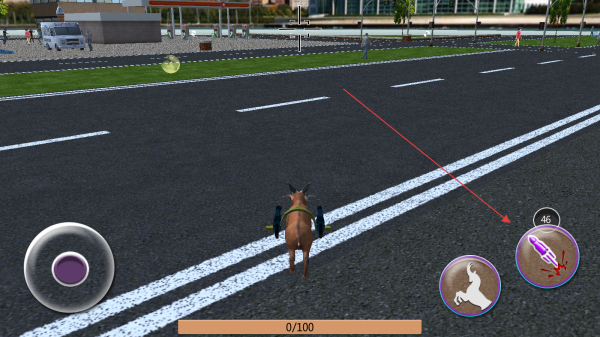 1、点击继续按钮进入城市场景,此时屏幕左下角会显示方向操控键,右下角有跳跃按钮,先通过方向键控制山羊在街道上移动,熟悉布局并尝试点击跳跃按钮让山羊越过路边障碍物。