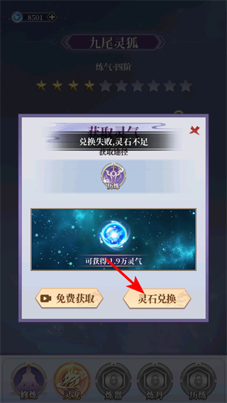 4、在灵宠培养界面,可通过灵石兑换获取灵气,为灵宠升级和突破提供资源,增强能力。