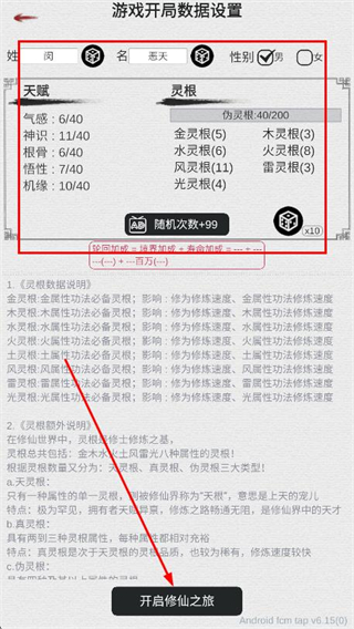 2、在游戏局数据设置界面,自定义角色数值,点击开启修仙之旅。