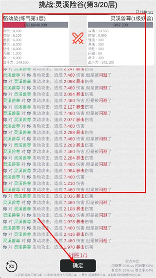 4、历练战斗中,查看与灵溪兽的攻防数据,点击确定结算奖励。