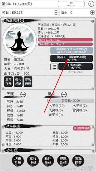 养成流程围绕历练-战斗-资源-提升循环展开,通过挑战灵溪险谷等历练区域获取灵石,用资源提升境界与属性,再挑战更高层级的历练,让成长节奏完全由玩家掌控。