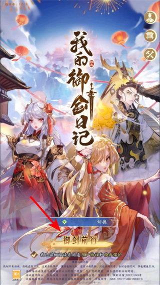 1、在游戏启动界面,点击红色箭头指向的御剑前行按钮,即可进入游戏主流程,开启冒险。