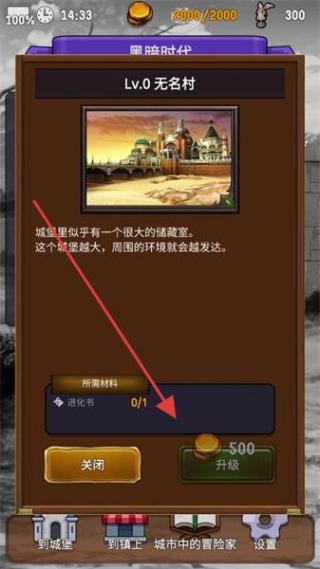 2、进入界面,若拥有足够的进化书和金币,点击升级按钮提升村庄等级,村庄等级越高周边环境发展越好。