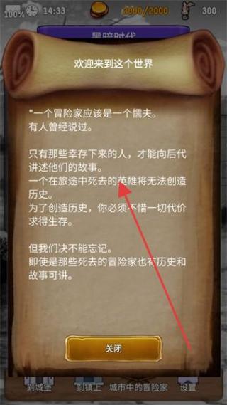 1、阅读提示内容,了解核心观念,即生存对于冒险家的重要性,读完点击关闭进入下一步。