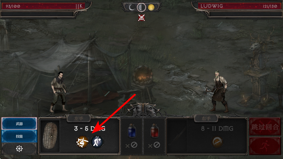 2、战斗界面中,点击红色箭头指向的左手武器攻击按钮,可对敌方造成3-5点伤害,消耗资源进行输出。