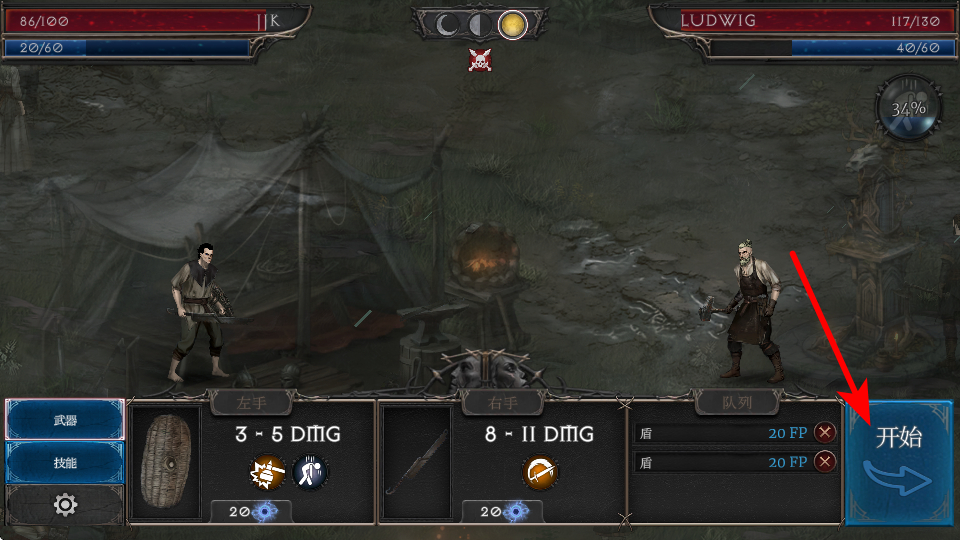 3、选择攻击方式后,点击红色箭头指向的开始按钮,即可执行当前回合的战斗操作,与敌方交互。