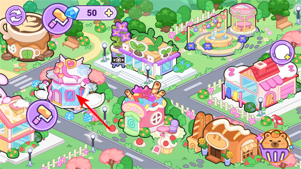 1、在游戏中,点击主题建筑,场景进行装饰和互动,开启趣味装扮玩法的关键操作,解锁角色装扮、场景内容。
