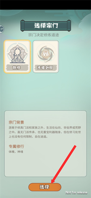 2、进入宗门选择界面后,选定对应的宗门类型如散修,这是确定修行方向的基础操作,对应不同的修行体系与成长路径。