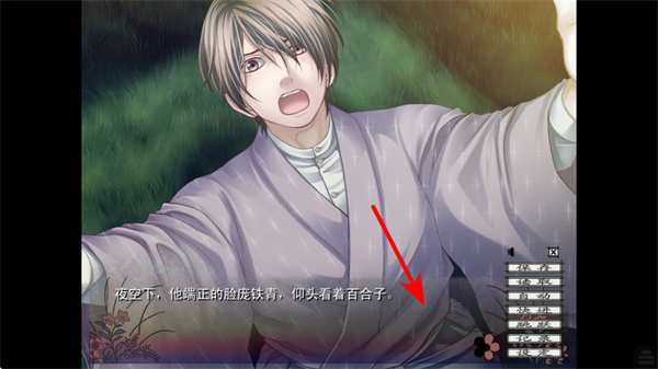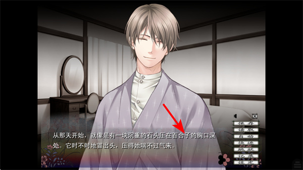 3、在剧情界面中,阅读当前的文本描述如沉重的石头压在百合子胸口,同时可通过右侧选项栏互动推进剧情。