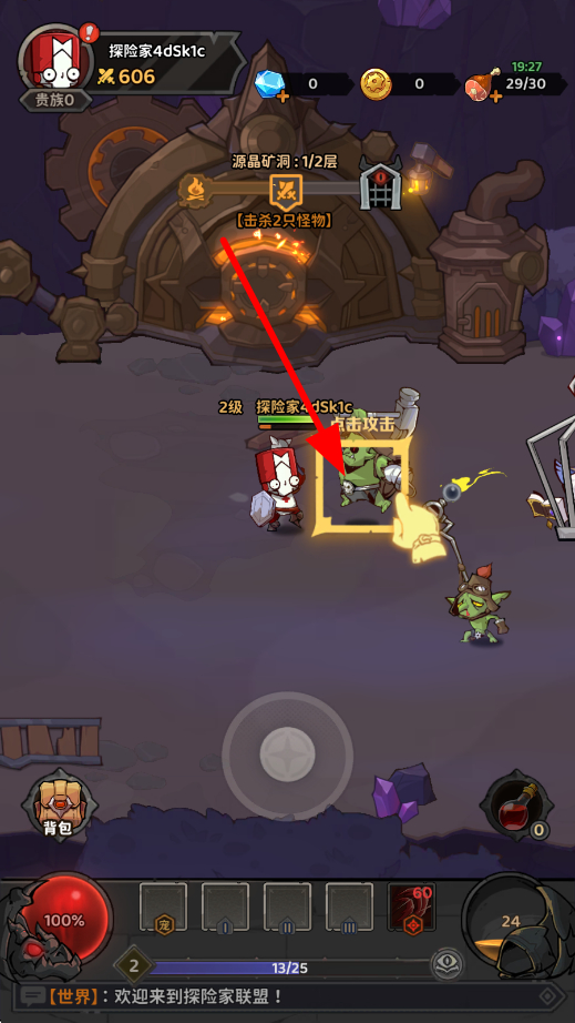 2、接着进入源晶矿洞等场景,遇到怪物时,点击攻击按钮,对怪物发起攻击,通过击杀怪物推进关卡进度,获取相应的奖励。