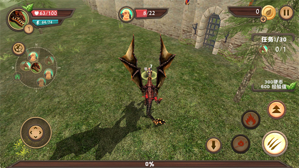 4、进入游戏主场景后,用左侧移动按钮操控龙移动,完成右侧任务1/30的目标以获取硬币和经验值。