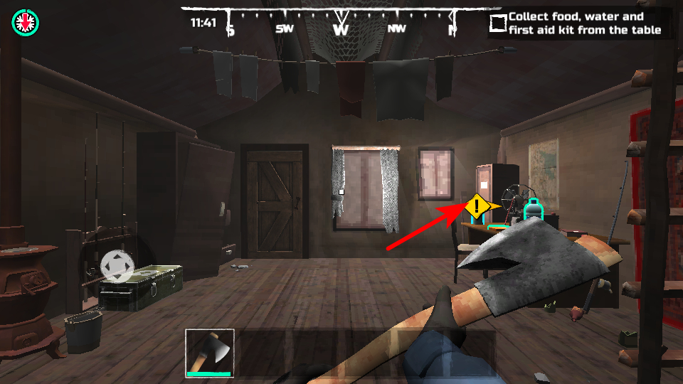 1、在游戏中,靠近屋内的桌子区域,收集食物、水和急救包等生存资源,这些资源是维持角色生命、应对关键保障。