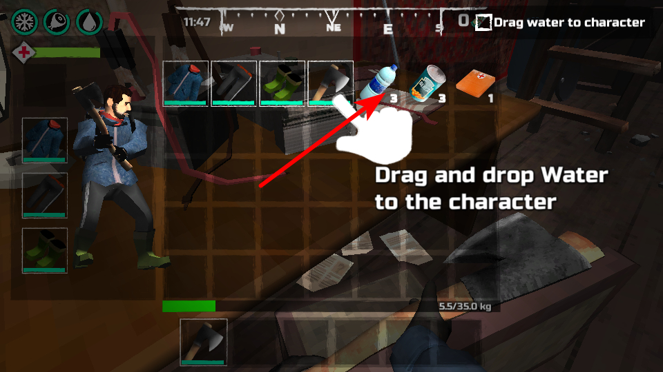 3、在背包中拖拽水到角色身上,及时补充水分是生存的基础操作,保持水分充足可避免角色因缺水陷入生存危机。