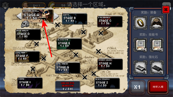1、游戏中需选择区域如STAGE A进入关卡,选择时需关注区域的难度和奖励,选择适合自身战力的区域开启冒险。