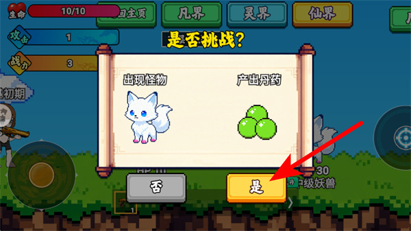 3、紧跟红色箭头指引,在是否挑战弹窗中点击是,确认挑战妖兽,完成挑战后可获取丹药奖励。
