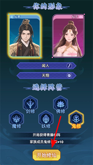 1、进入游戏创建界面后,选择形象和鬼修阵营,点击红色箭头指向的开始修仙按钮,开启修仙冒险,进入游戏的关键操作。