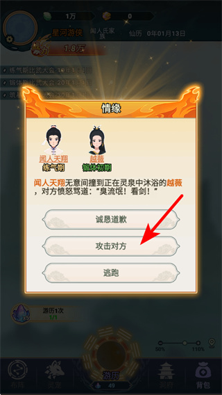 3、触发情缘事件后,点击红色箭头指向的攻击对方选项,选择该互动方式推进情缘剧情,不同选择会影响后续的剧情发展。