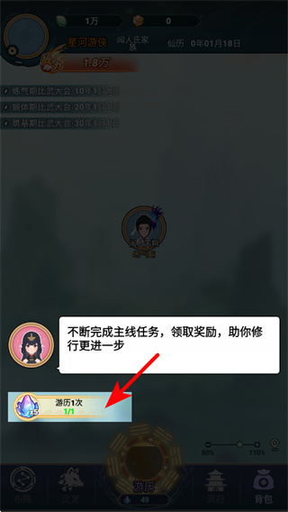 4、完成互动后,点击红色箭头指向的游历1次按钮,继续进行游历操作,完成主线任务以领取奖励,助力修仙道行的提升。