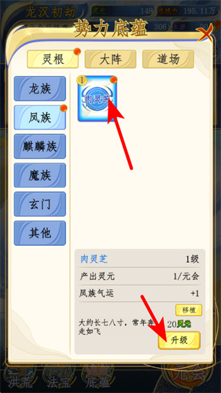 4、进入势力底蕴界面后,选择灵根道具,点击升级按钮,强化资源产出的重要操作,升级后灵根的资源产出效率会提升,加速势力的发展进度。